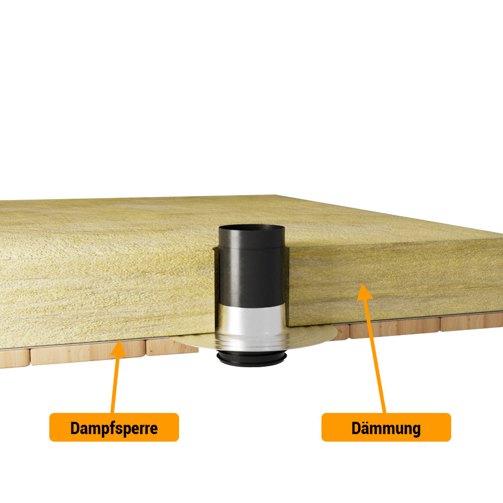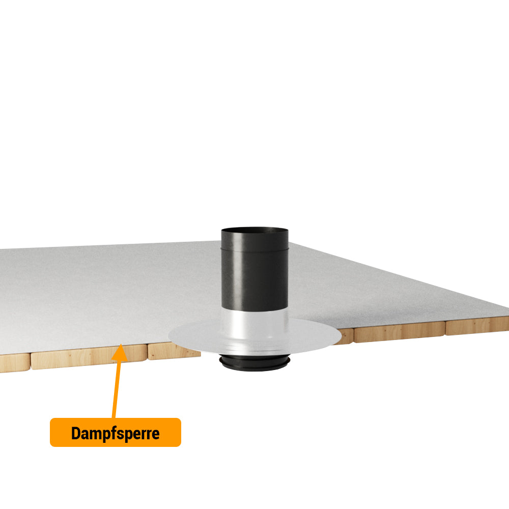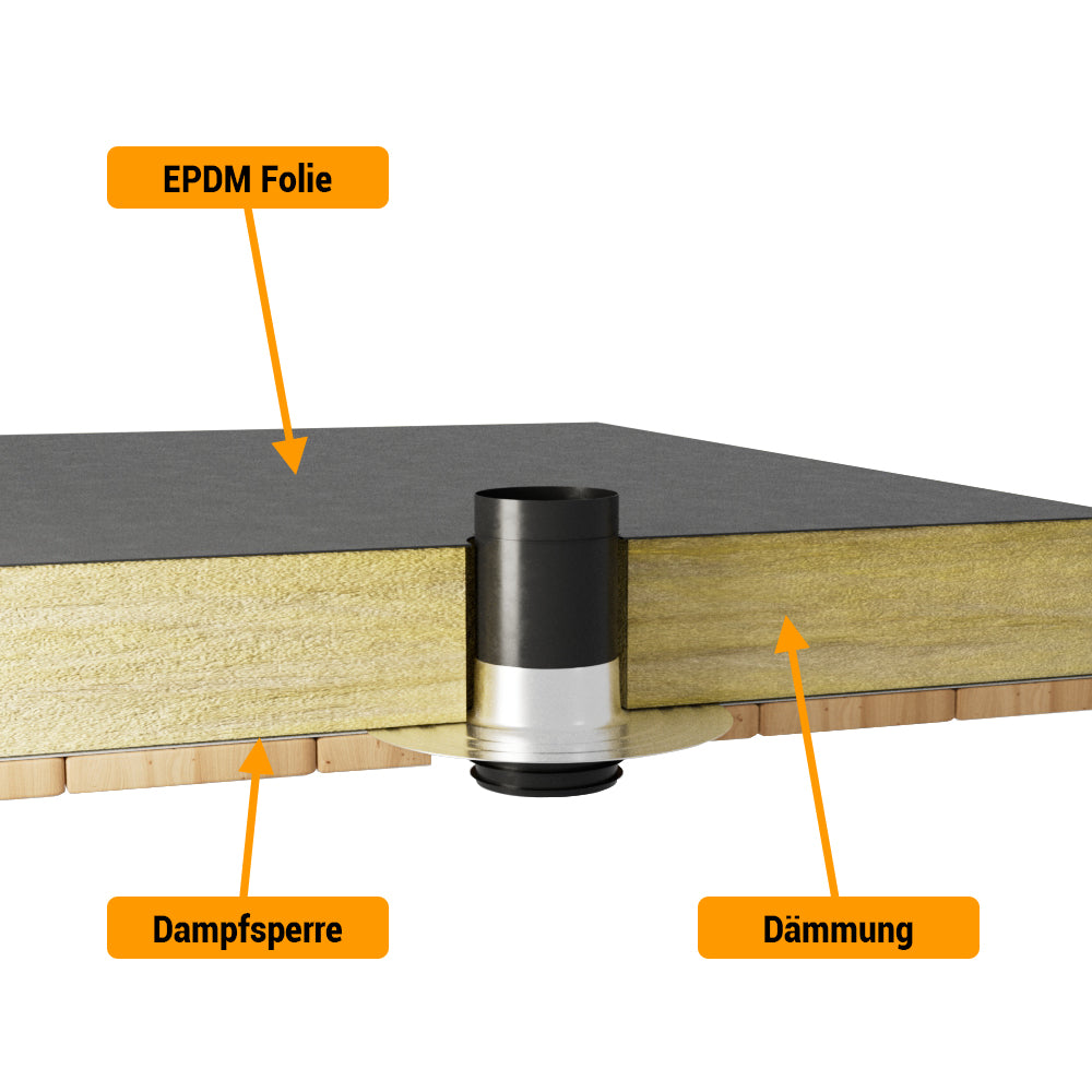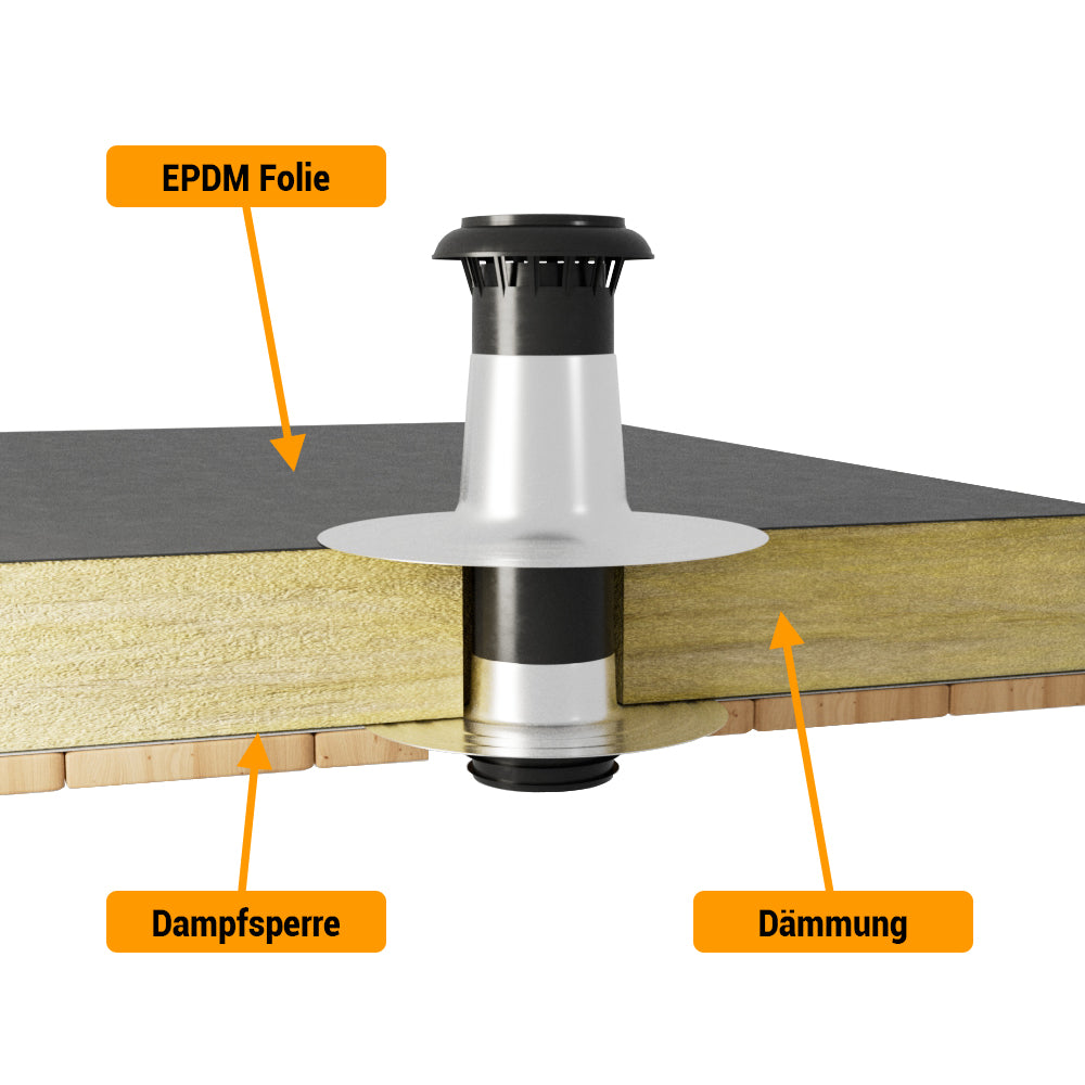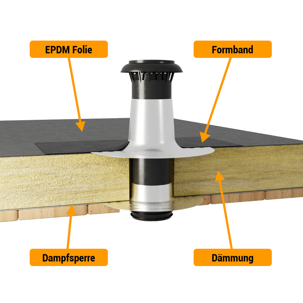 Das DACHPROTECT Aufstockelement mit Anschlussflansch Dampfsperre wurde speziell für gedämmte Flachdachaufbauten entwickelt. Es überbrückt zuverlässig die Dämmschicht und ermöglicht einen fachgerechten Anschluss an die Dampfbremse unterhalb der Dämmung.