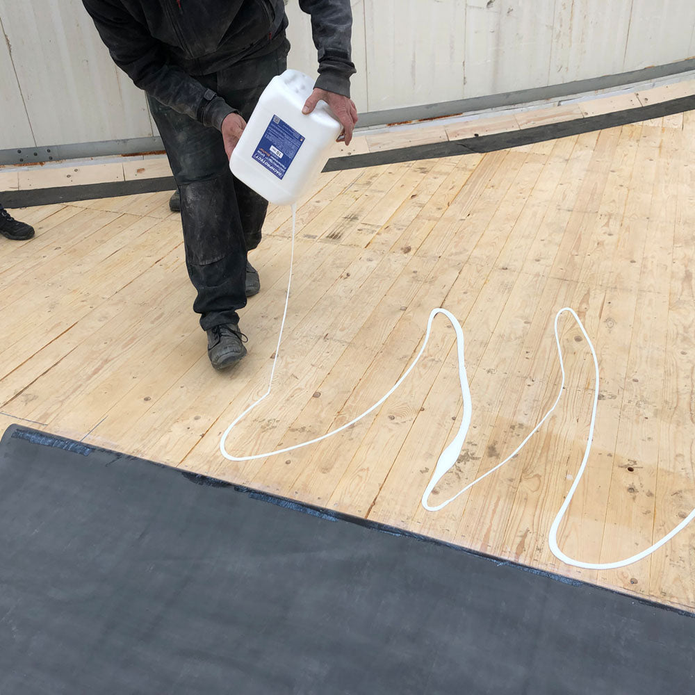 Der Flächenkleber BlueTek eignet sich besonders für diffusionsfähige Untergründe wie Holz im Nassklebeverfahren und für nicht diffusionsfähige Untergründe wie PU-Dämmung oder Beton im Kontaktklebeverfahren. Randbereiche und Aufkantungen sind generell im Kontaktklebeverfahren auszuführen. Die Verarbeitung erfolgt effizient mit einer handelsüblichen Malerrolle – ganz ohne Spezialwerkzeug.