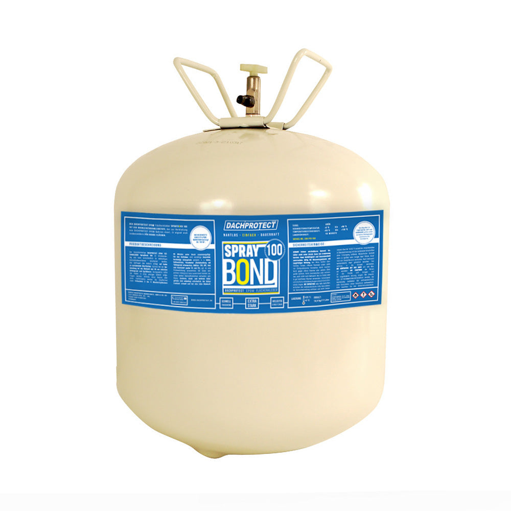 Der lösemittelhaltige DACHPROTECT EPDM Flächenkleber SprayBond ist hitzebeständig und kann ausschließlich im beidseitigen Kontaktklebeverfahren verarbeitet werden. Das Auftragen des Klebers erfolgt auf beide zu verklebende Oberflächen. Optimal bei der Verwendung ist ein Abstand von ca. 30 cm zwischen Untergrund und Dose. Vorzugsweise sollte der Kleber in einer einzigen Schicht aufgetragen werden. In den Randbereichen/auf den Hochzügen werden die Oberflächen nach frühestens 5 bis 10 Minuten/spätestens 45 Minuten unter Druck mithilfe einer Silikon-Andrückrolle zusammengefügt. In der Fläche werden die Oberflächen nach frühestens 15 bis 20 Minuten/spätestens 45 Minuten unter Druck mithilfe einer Flächenwalze (45 bis 50 kg) zusammengefügt.