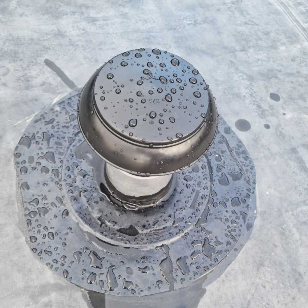 Die UV-beständige Wetterkappe aus robustem PP-Kunststoff sorgt für eine hohe Lüftungskapazität und schließt bündig mit der Klebeplatte ab. Das modulare System erlaubt eine Verlängerung unter und über Dach, was besonders bei individuellen Dachaufbauten von Vorteil ist.
